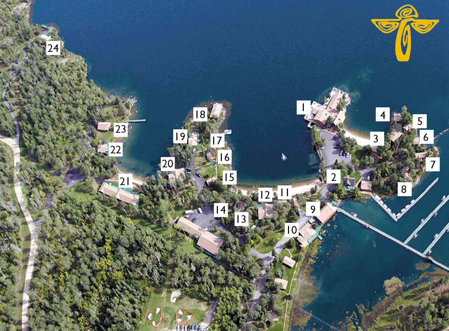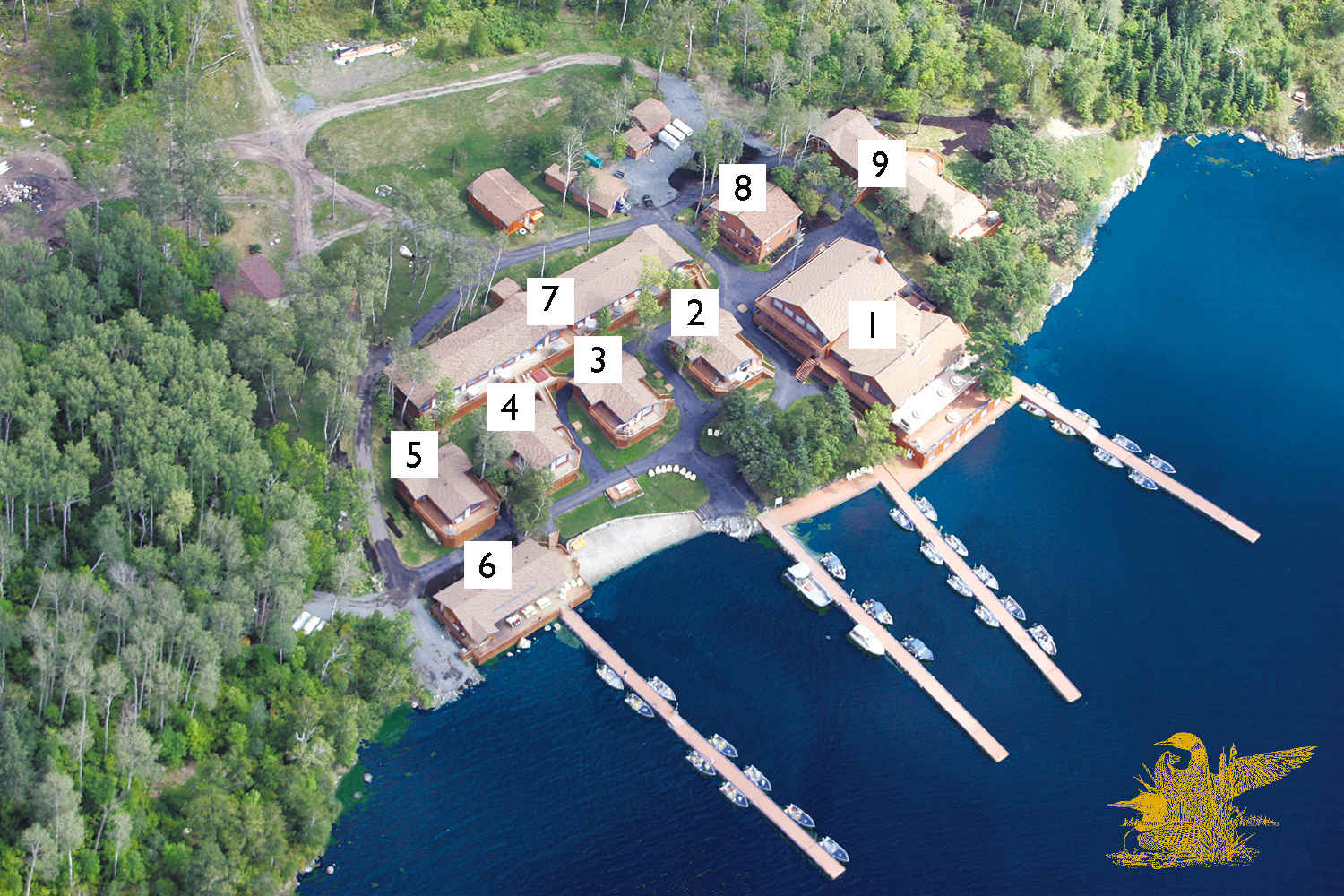 The resort map is divided into four properties (Totem Lodge, Wiley Point Lodge, Yellowbird Lodge, and French Portage Outpost) and also includes private islands, all located on Lake of the Woods.